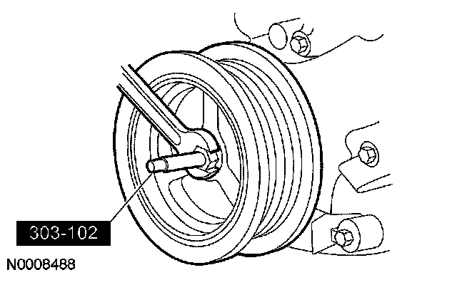 25. Using a new crankshaft pulley bolt, install the crankshaft pulley bolt and washer. Using the special tool to hold the crankshaft pulley, tighten the bolt in 4 stages: