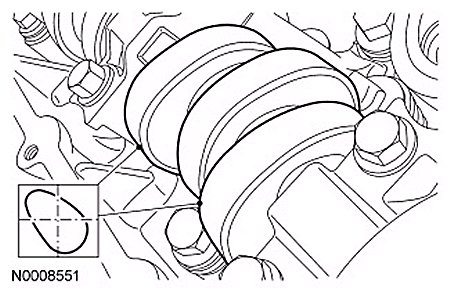 NOTICE: If one or both tensioner mounting bolts are loosened or removed, the tensioner-sealing bead must be inspected for seal integrity. If cracks, tears, separation from the tensioner body or permanent compression of the seal bead is observed, install a new tensioner or engine damage may occur.