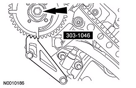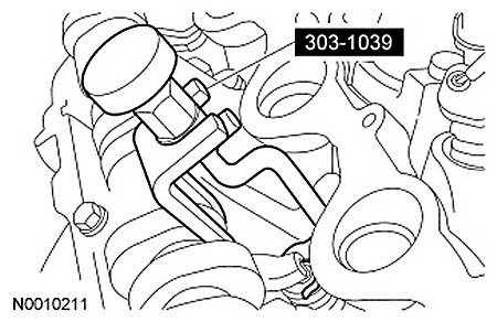 14. Using the Cam Phaser Locking Tool, remove the bolt and the RH camshaft phaser and sprocket assembly.