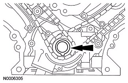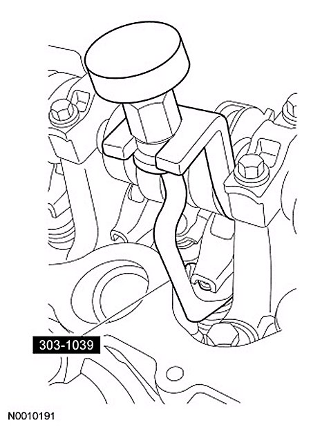 NOTICE: Remove the front thrust camshaft bearing cap straight upward from the bearing towers or the bearing cap may be damaged from side loading.