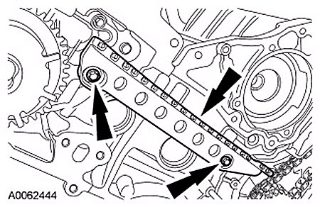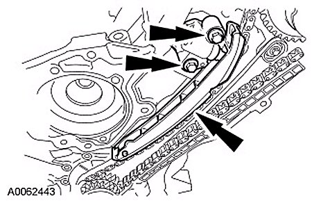 10. Remove the 2 bolts, the LH timing chain tensioner and tensioner arm.