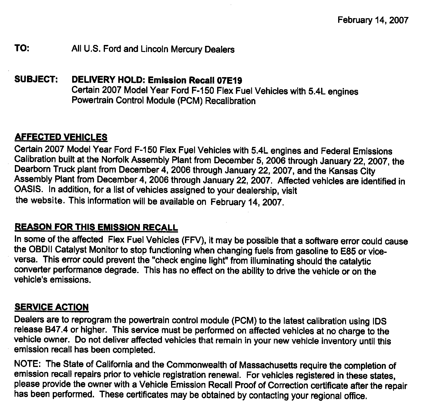 Recall - PCM Update for OBDII Cat Monitor Function
