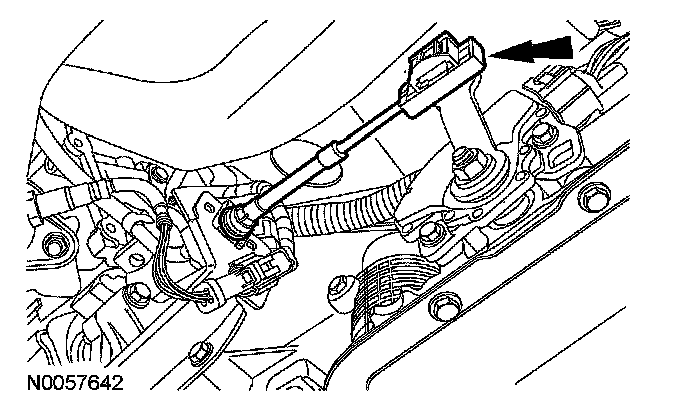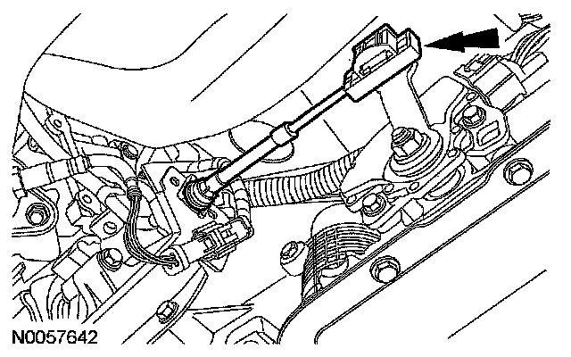 8. NOTE: When installing the selector lever cable, make sure that the selector lever cable locking tabs are locked in place and the cable end is snapped onto the ball stud. Press the selector lever cable into the bracket and listen for the cable to click in place. Pull back on the selector lever cable to make sure that it is locked into the bracket. Also make sure that the selector lever cable end is correctly installed onto the ball stud. Pull back on the selector lever cable end to make sure that the cable end is correctly installed.