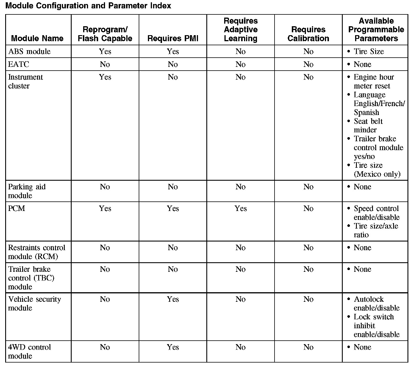 Programmable parameters are customer preference items that may be modified by the dealer via scan tool or in some cases modified by the customer following a procedure listed in the vehicle Owner's Literature. While many configuration options may exist for a module, only a few of these options are programmable parameters