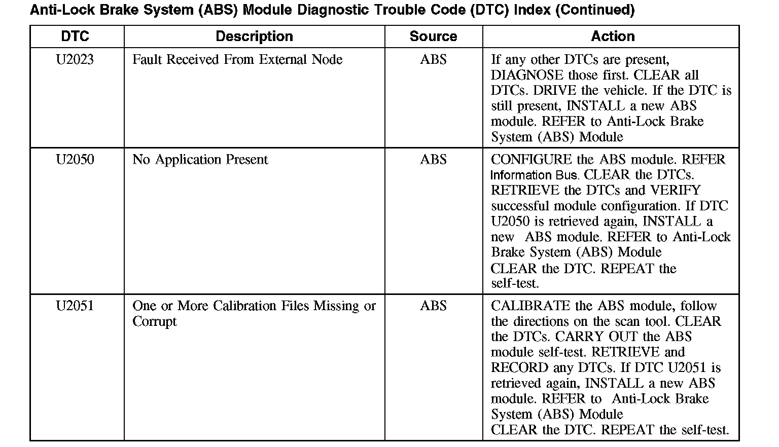 Anti-Lock Brake System (ABS) Module Diagnostic Trouble Code (DTC) Index