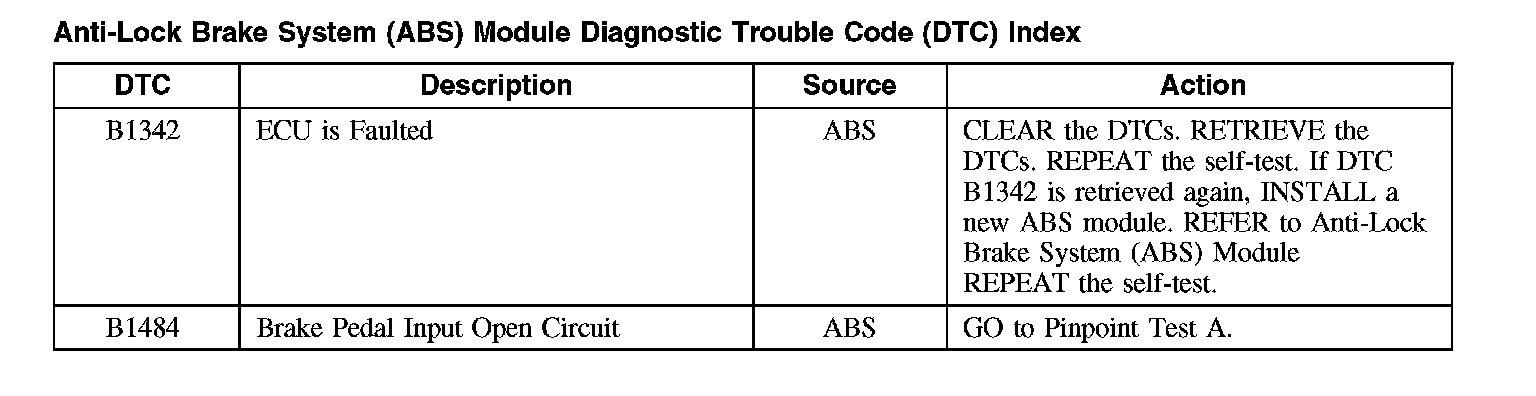 Anti-Lock Brake System (ABS) Module Diagnostic Trouble Code (DTC) IndexB1342-B1484: