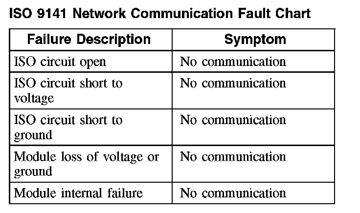 The fault chart describes the specific ISO 9141 network failures and their resulting symptom.