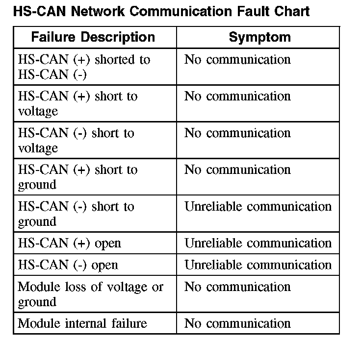 The fault chart describes the specific HS-CAN network failures and their resulting symptom.