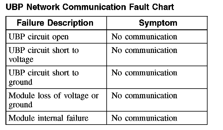 The UBP communication network is a single circuit communications network, circuit 2077 (PK/LB). The UBP communications network does not function if the wire is shorted to ground or voltage. The UBP communication network allows intermodule communication. The UBP network operates at a maximum data transfer speed of 9.6 Kbps.