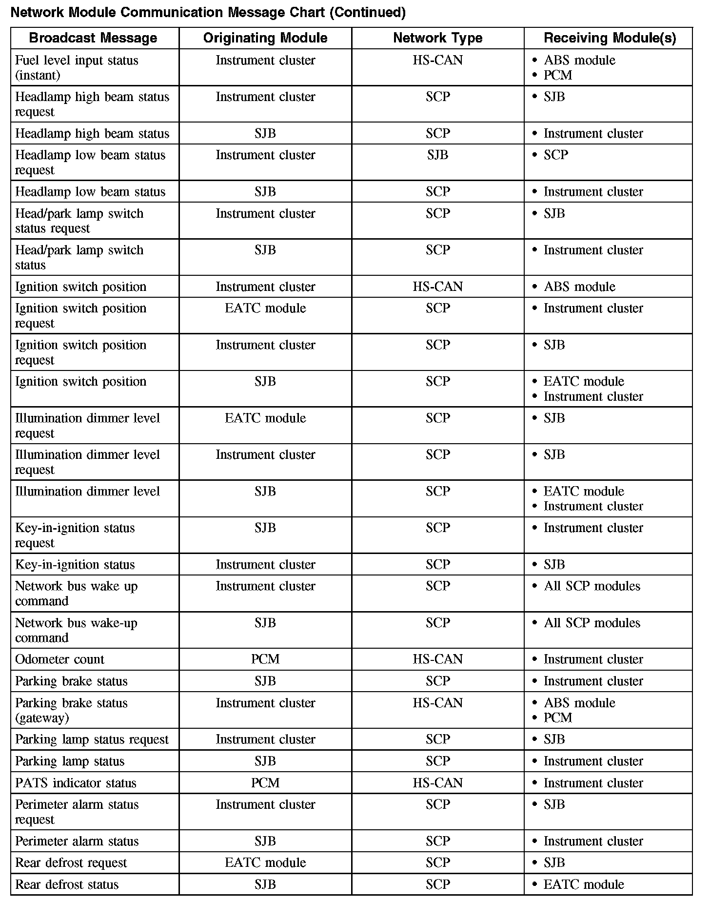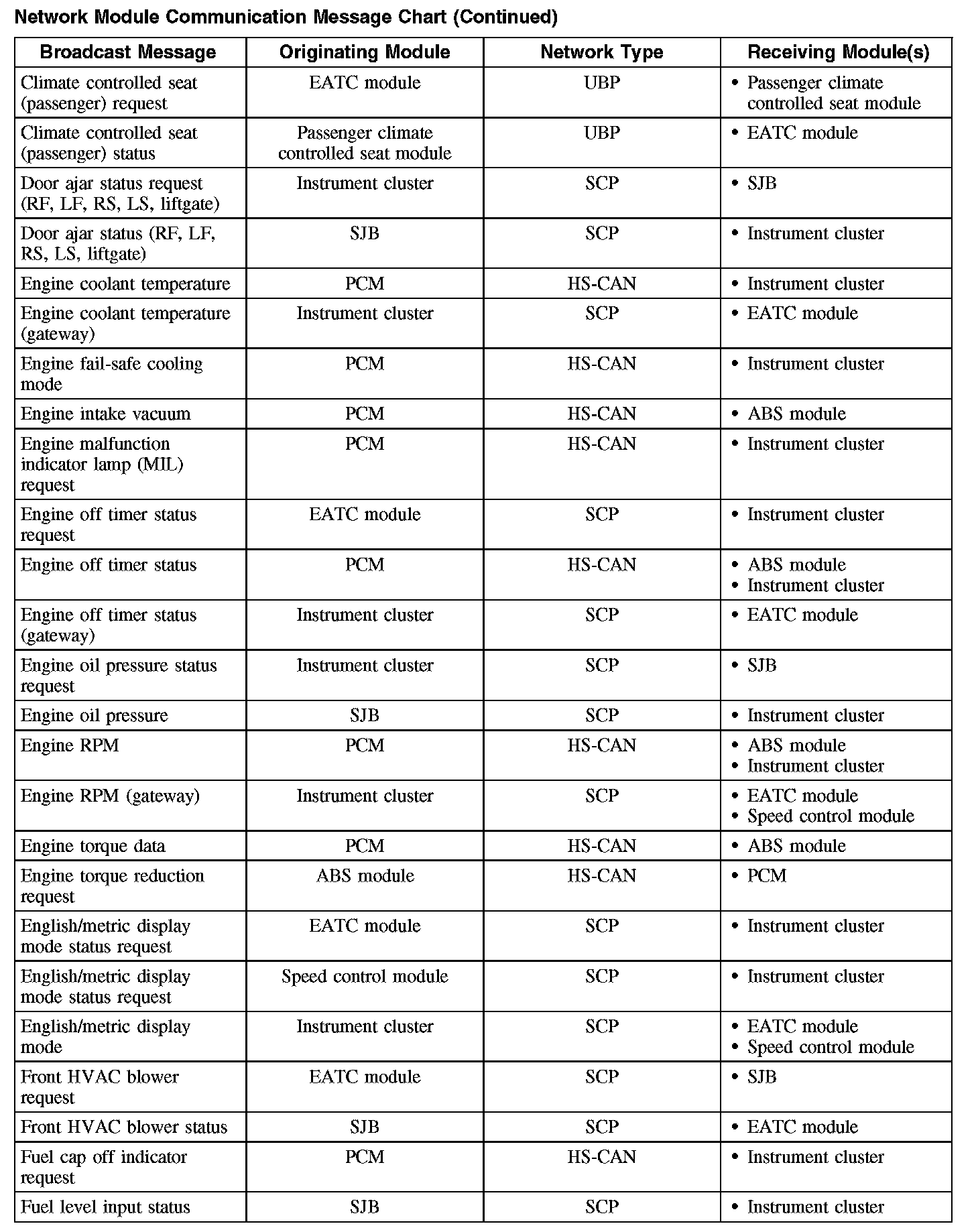 The chart describes all network messages broadcast on HS-CAN, SCP and UBP by each module, and the module(s) that receive the message.