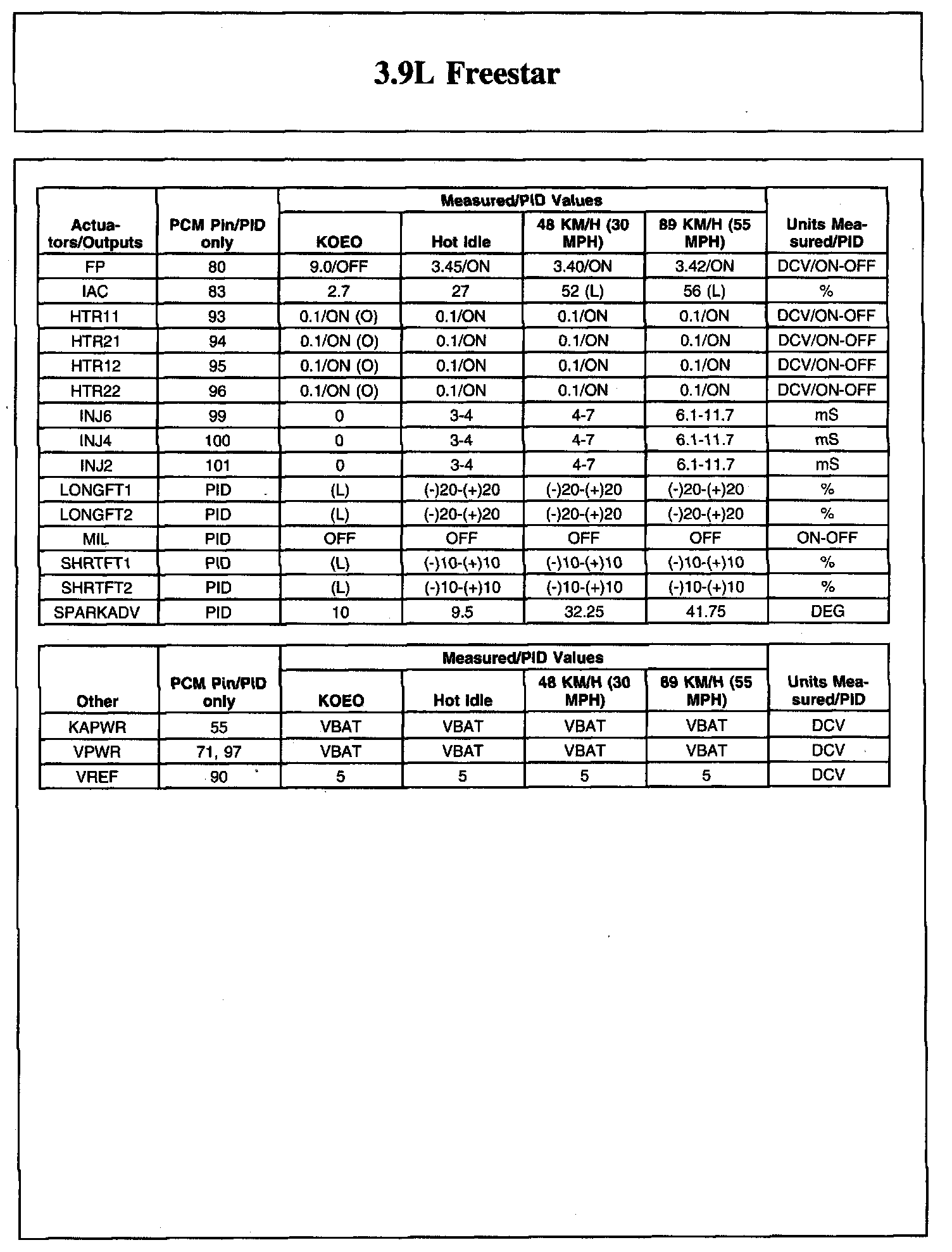 The Typical Diagnostic Reference Value Charts do not display fault parameter identifications (PIDs). These are PIDs which indicate a hard fault with the circuit. They display a value of YES or NO and are PIDs ending with the letter F.