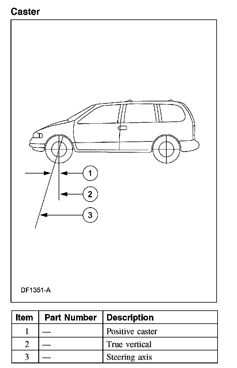 Caster is the deviation from vertical of an imaginary line drawn through the ball joints when viewed from the side. The caster specifications will give the vehicle the best directional stability characteristics when loaded and driven. The caster setting is not related to tire wear.