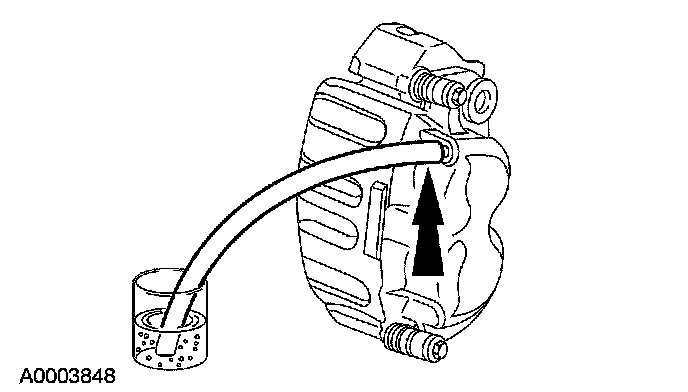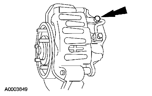 10. Loosen the RH front brake caliper bleeder screw until a stream of brake fluid comes out. While the assistant maintains pressure on the brake pedal, tighten the RH front brake caliper bleeder screw.