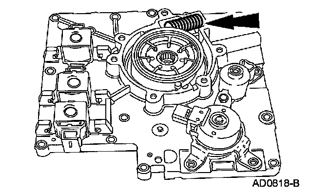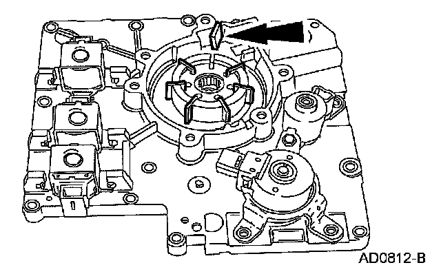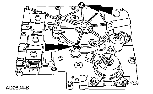 Remove the shift solenoids by pressing locking tab with a screwdriver and rotating them.