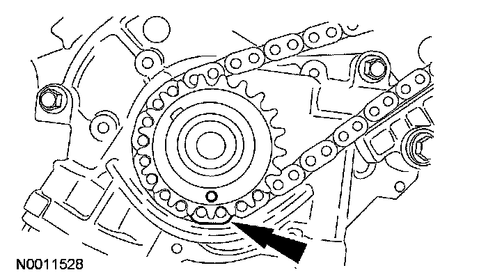 18. NOTE: The camshaft phaser and sprocket will be stamped with one of the illustrated timing marks for the RH camshaft.