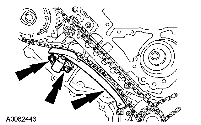 10. Remove the bolts, the LH timing chain tensioner and tensioner arm.