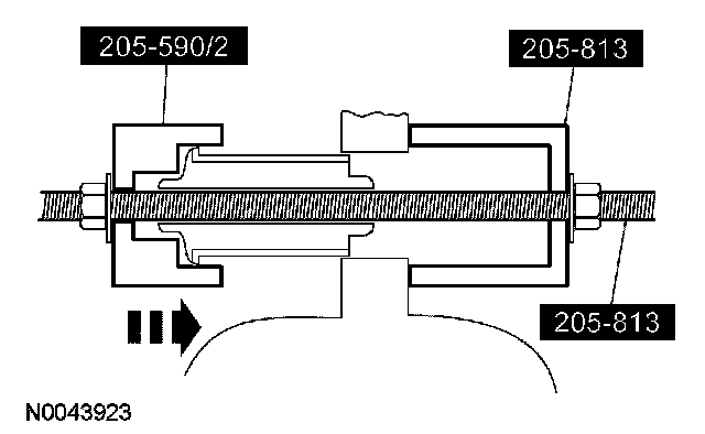 5. Partially lower the rear axle and, using the special tools, remove the upper control arm bushing.