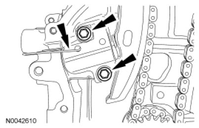 11. Position the timing chain tensioner and install the 2 bolts.