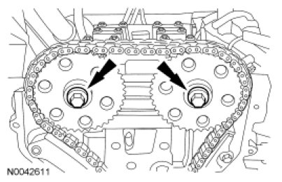 3. If removed, install the camshaft sprockets and the 2 bolts. Do not tighten the bolts at this time.