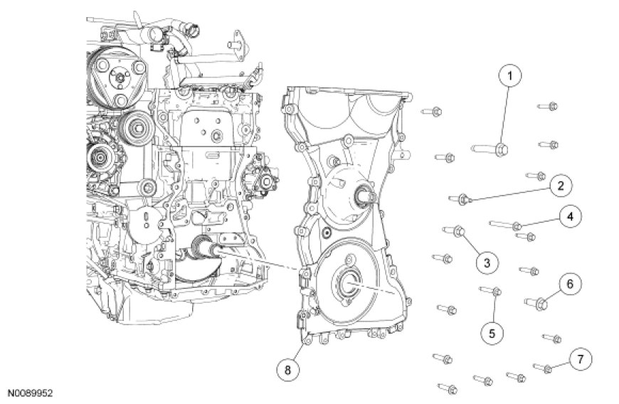 - Stage 1: Tighten the seventeen 8-mm bolts and the stud bolt to 10 Nm (89 lb-in).