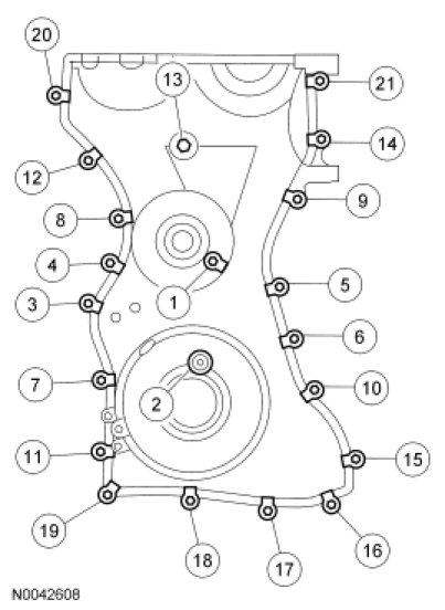 3. Install the front cover. Tighten the 21 bolts in the sequence shown in 3 stages.