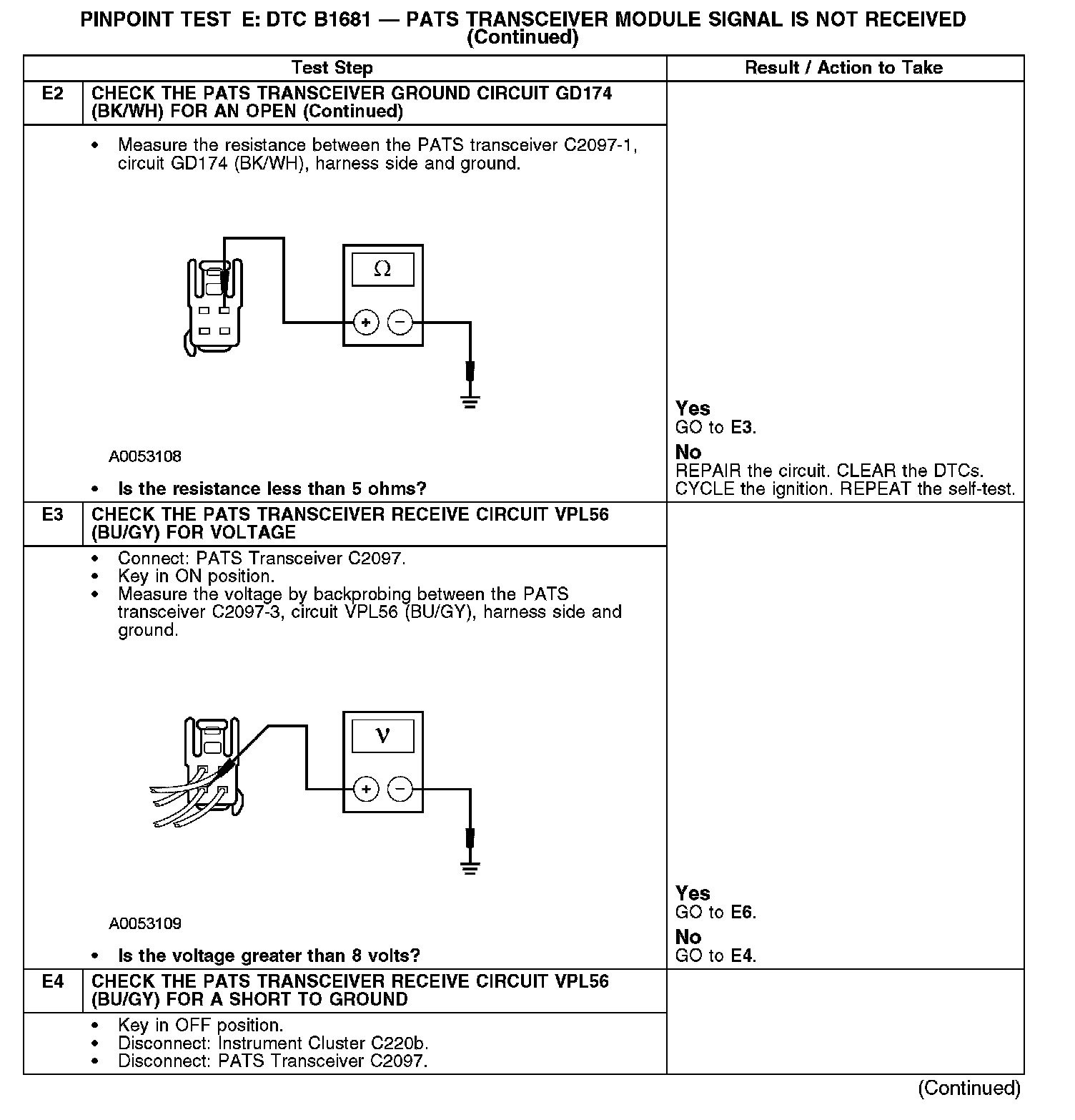 PINPOINT TEST E: DTC B1681 - PATS TRANSCEIVER MODULE SIGNAL IS NOT RECEIVEDE1-E2: