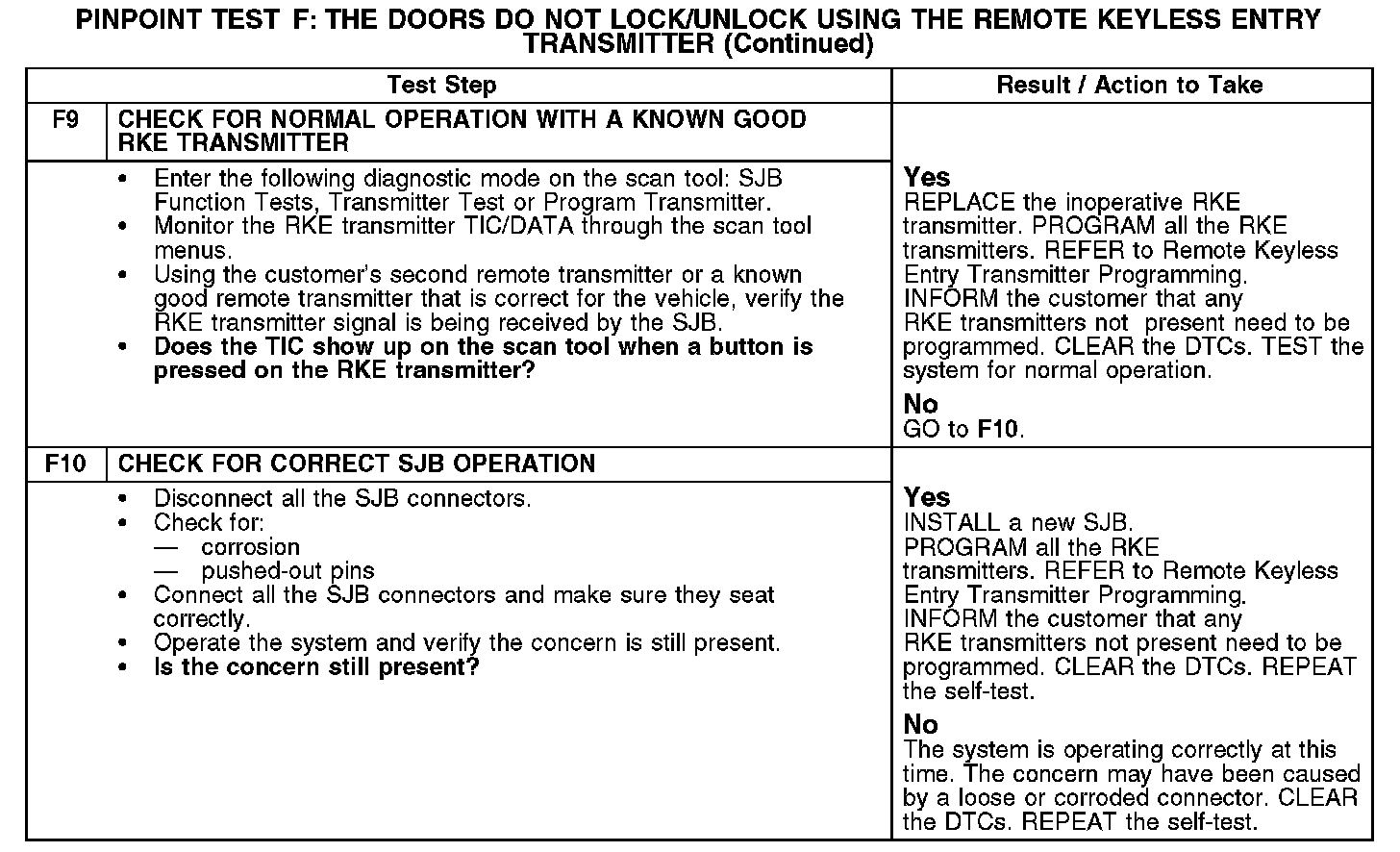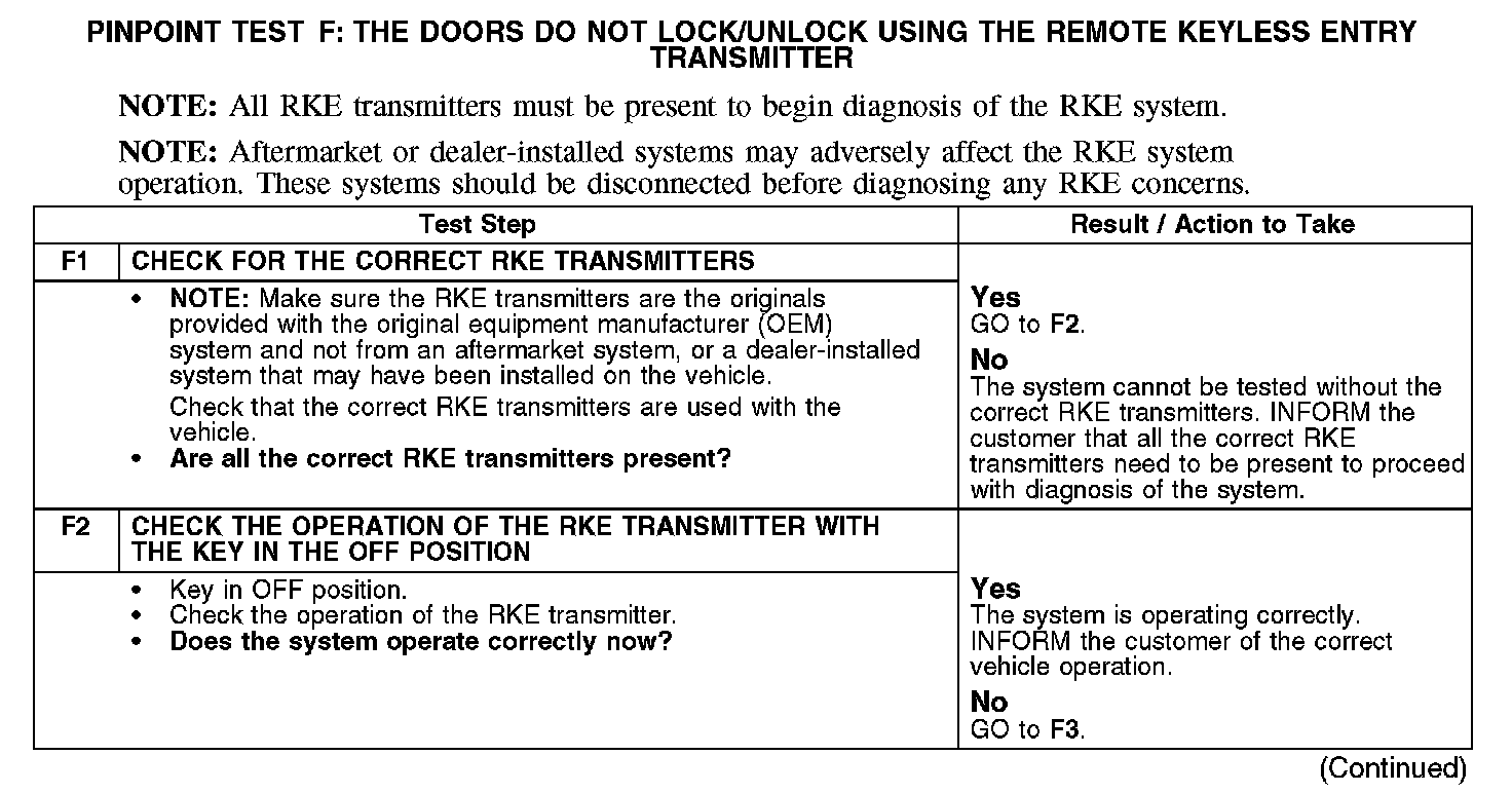 Pinpoint Test F: The Doors Do Not Lock/Unlock Using The Remote Keyless Entry TransmitterF1-F2:
