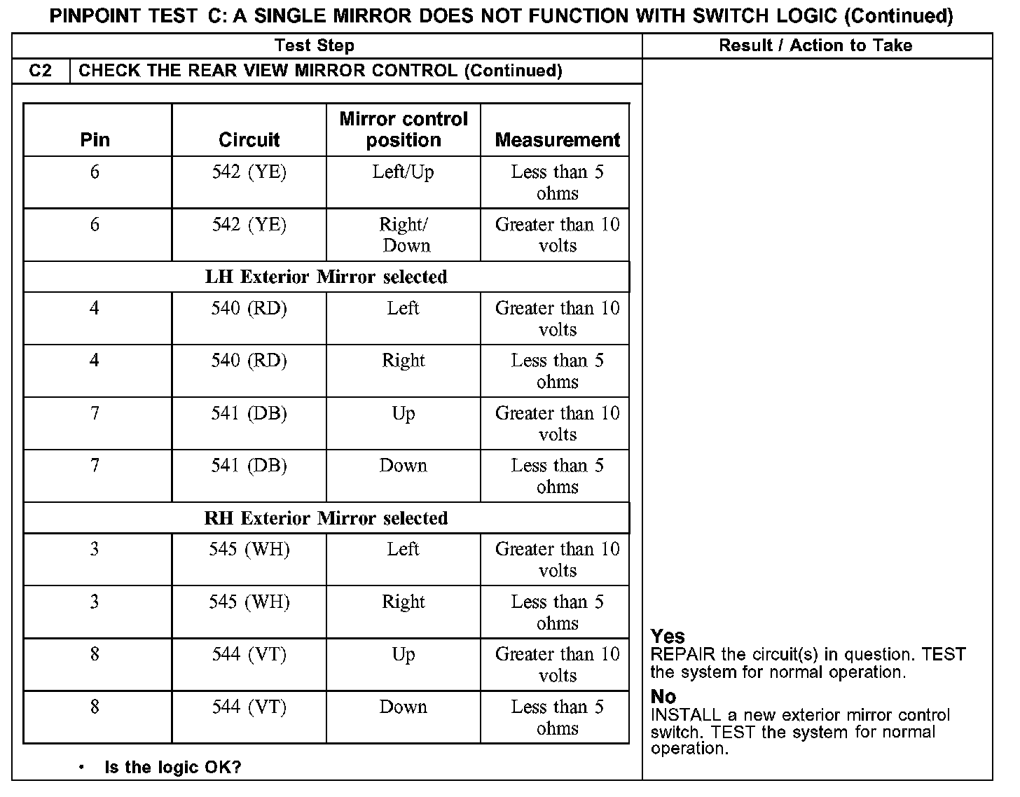 The exterior mirror control switch uses circuit 540 (RD) to control the LH exterior mirror left/right movement, circuit 541 (DB) to control the LH exterior mirror up/down movement, and circuit 542 (YE) as a common circuit to control the LH exterior mirror up/down and left right movement. The exterior mirror control switch uses circuit 545 (WH) to control the RH exterior mirror left/right movement, circuit 544 (VT) to control the RH exterior mirror up/down movement, and circuit 542 (YE) as a common circuit to control the RH exterior mirror up/down and left right movement. Each circuit is a switched voltage/ground circuit based upon the exterior mirror control switch position.