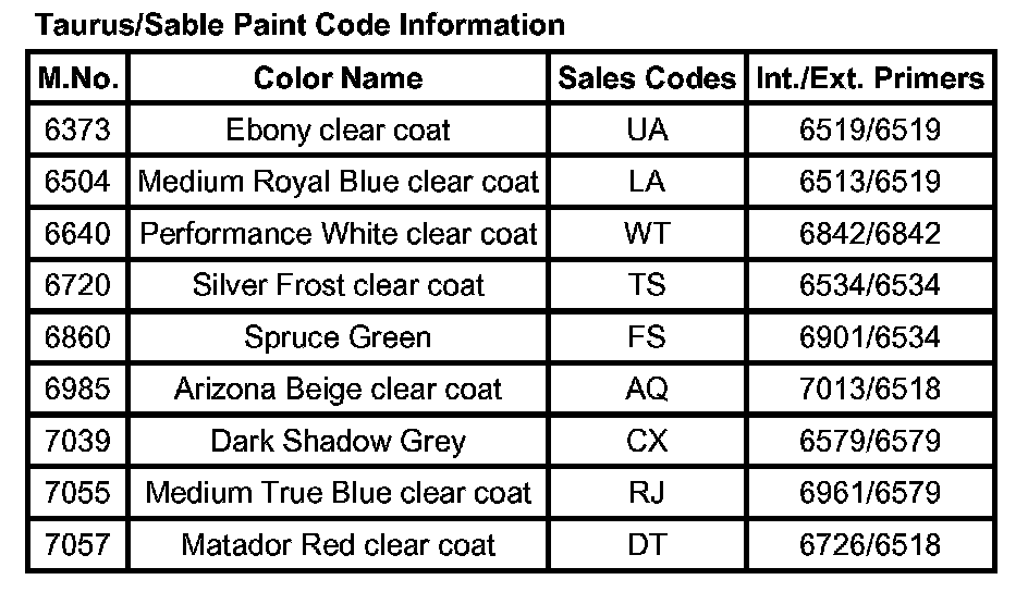 Taurus/Sable Paint Code Information