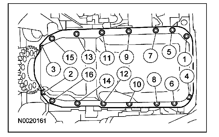 Tighten the oil pan bolts to 12 Nm (9 ft. lbs) in the sequence shown.