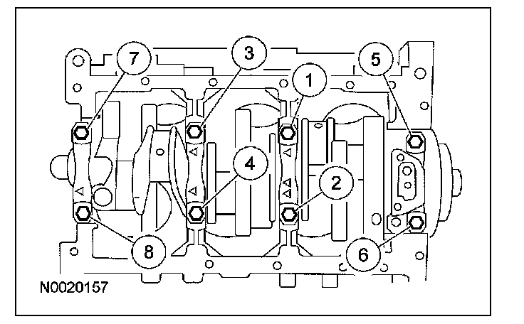 7. Install the 8 main bearing cap bolts in the sequence shown.