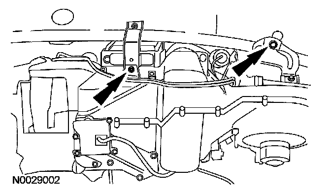 9. Remove the 2 condenser-to-evaporator line bracket bolts.