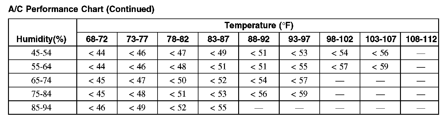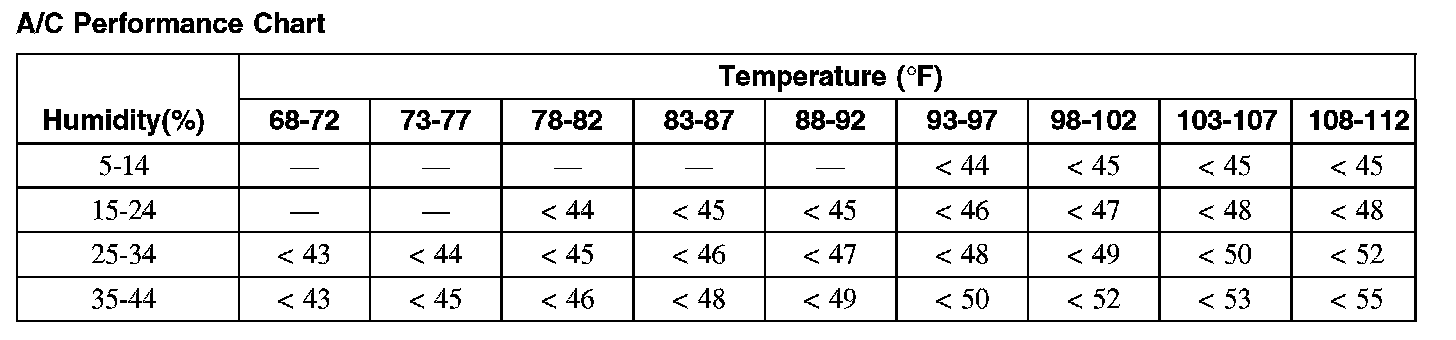 - If the Average Center Vent Temperature is less than the temperature in the A/C performance chart, no further diagnosis is required.