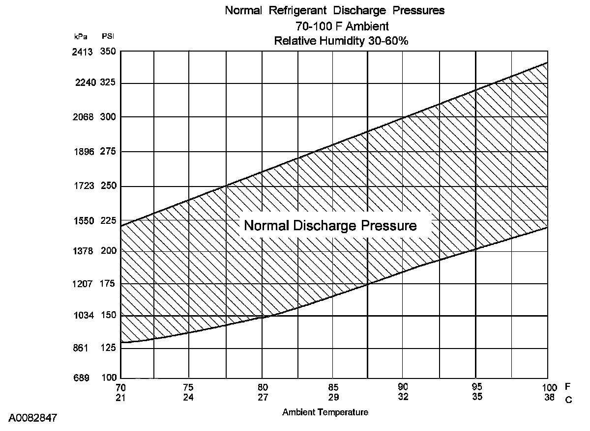 8. Determine if the discharge pressure falls within the normal operating limits using the Normal Refrigerant Discharge Pressures chart.
