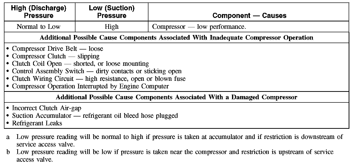 1. NOTE: The table is used to guide diagnosis of the refrigerant system if operating pressures are outside normal limits.