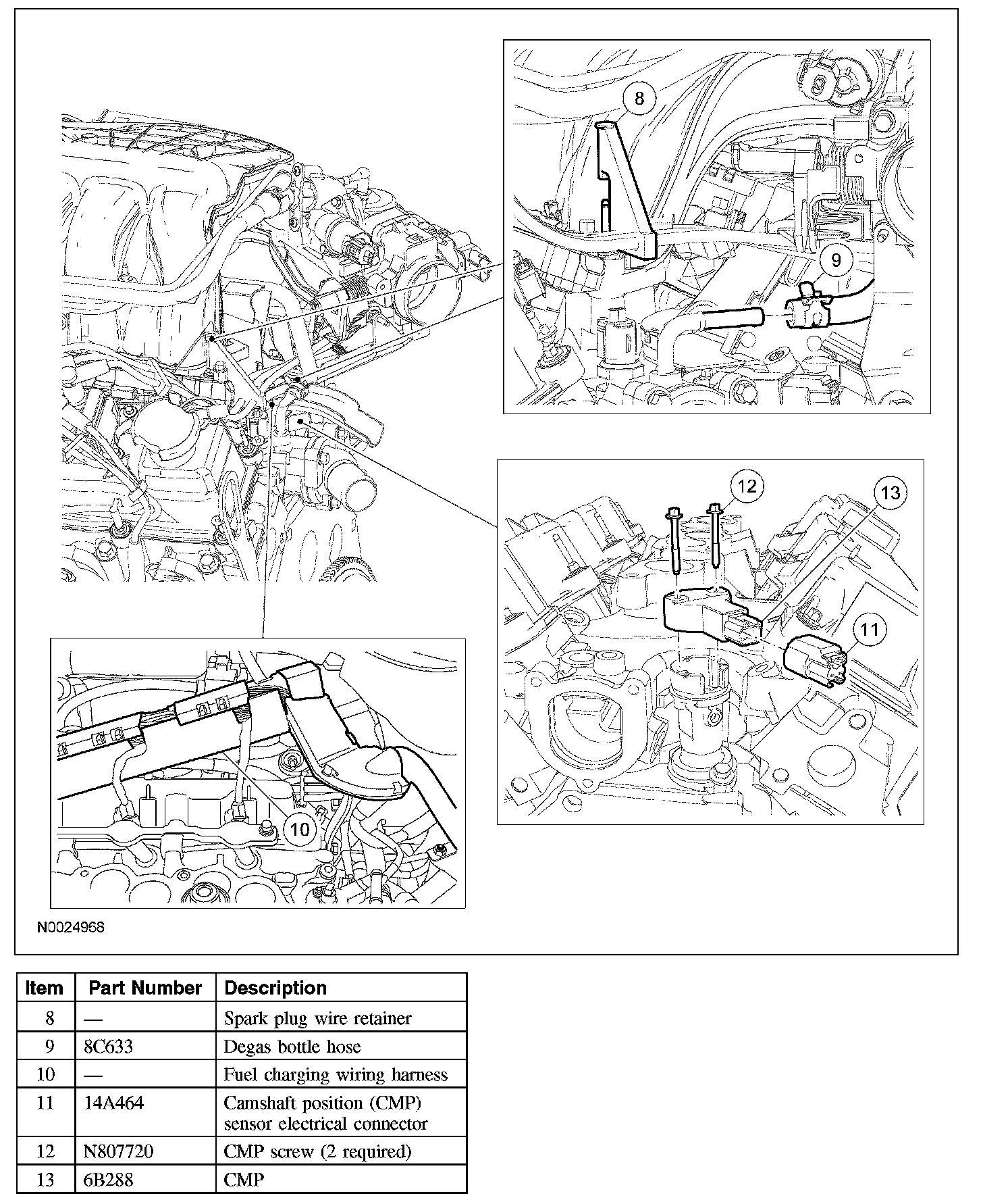 8. Release the fuel charging wiring harness from the valve cover studs and position the wiring harness away from the camshaft position sensor.