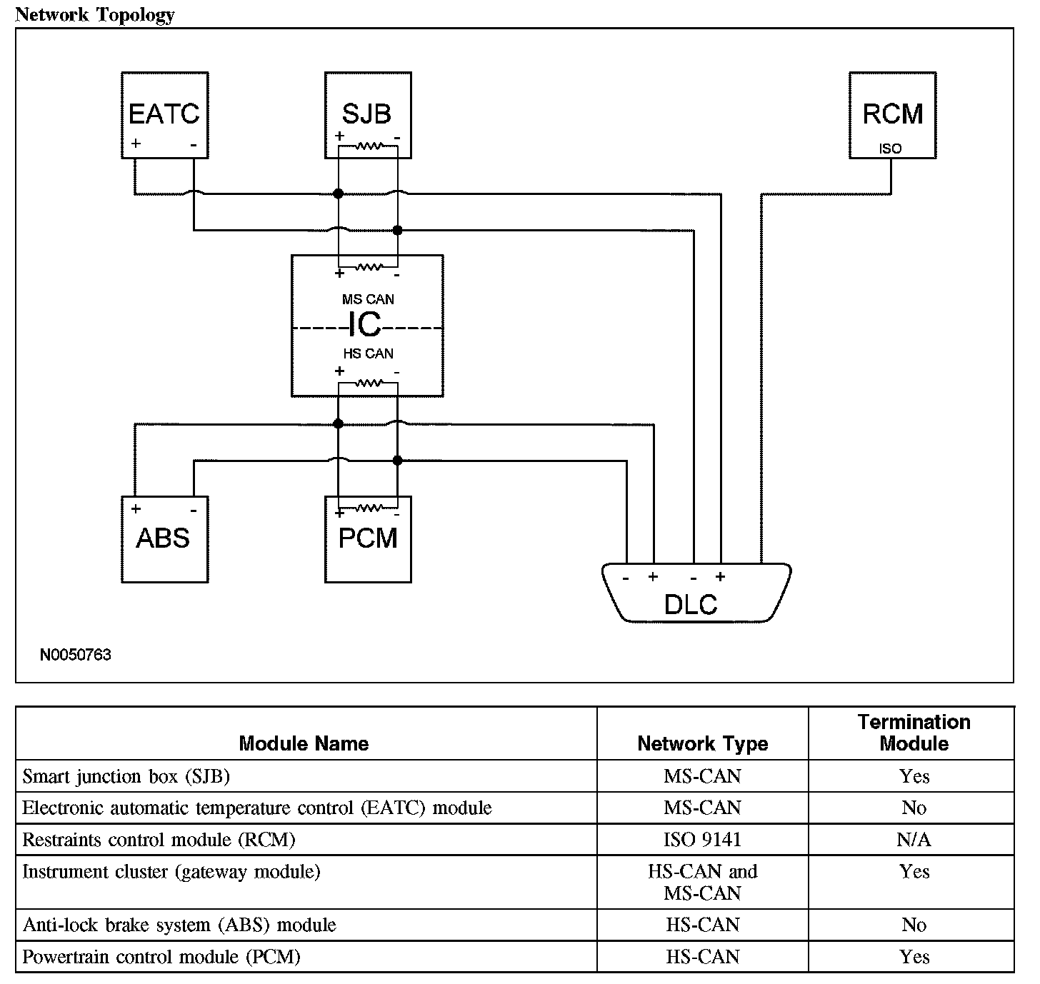 The CAN bus (+) and bus (-) circuits must always be terminated. The network termination of the CAN bus takes place inside a termination module by termination resistors. The resistors are located internal to the module, and are required for both the bus (+) and bus (-) circuits. Each resistor is rated at 120 ohms, and are located across the (+) and (-) circuits. The resistors are wired in parallel to the network bus circuits, for a total operating resistance of 60 ohms on a good network.