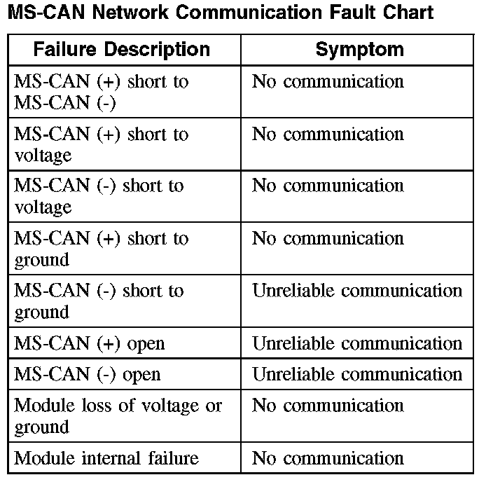 The fault chart describes the specific MS-CAN network failures and their resulting symptom.