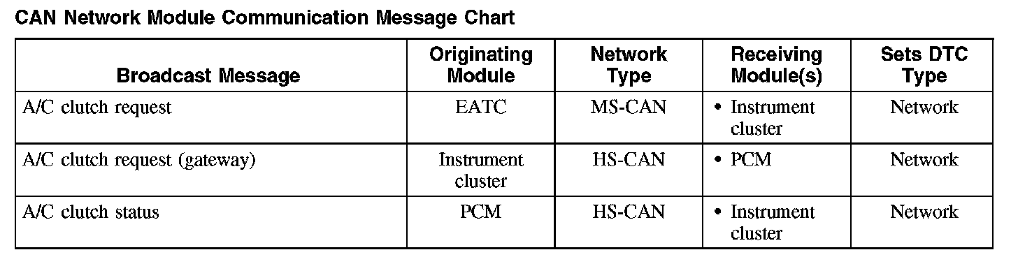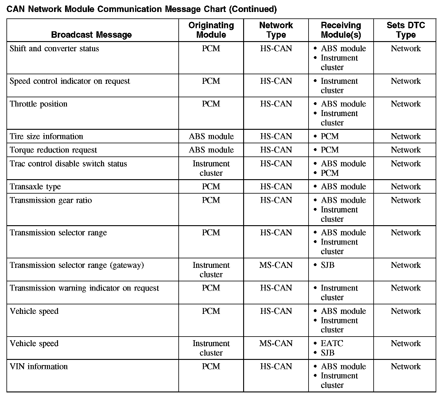 The chart describes the specific CAN network messages broadcast by each module, and the module(s) that receive the message.