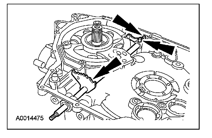 NOTE: The position of the manual valve detent lever is different than past models. The roll pin and shoulder point toward the driven sprocket support. Note the position of the lever during disassembly for correct assembly.