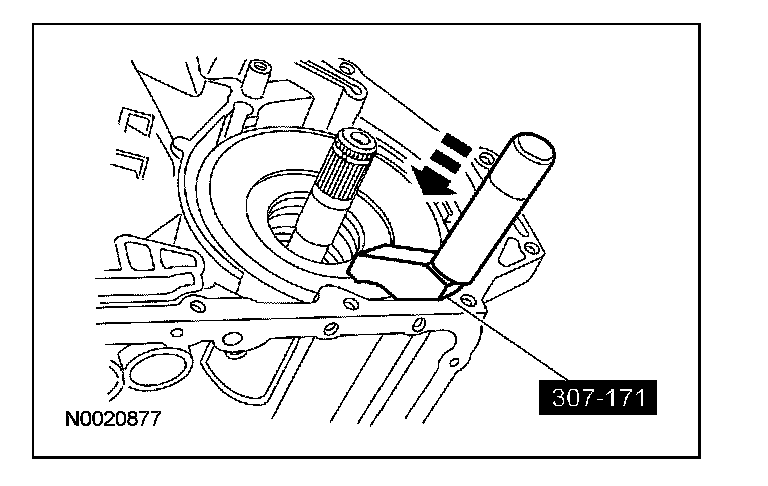 Position the special tool into the case and install the hook end of tool into one of the lube holes in the front sun shell. Position the block over the edge of the assembly and tighten the handle.
