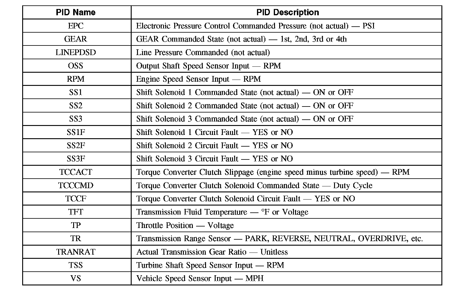 ^ LINEPDSD - Directs PCM to command line pressure to either 75, 100, 125, 150, 175, 200, 225 or 250 psi. The PCM will command the appropriate EPC current to obtain the commanded line pressure.