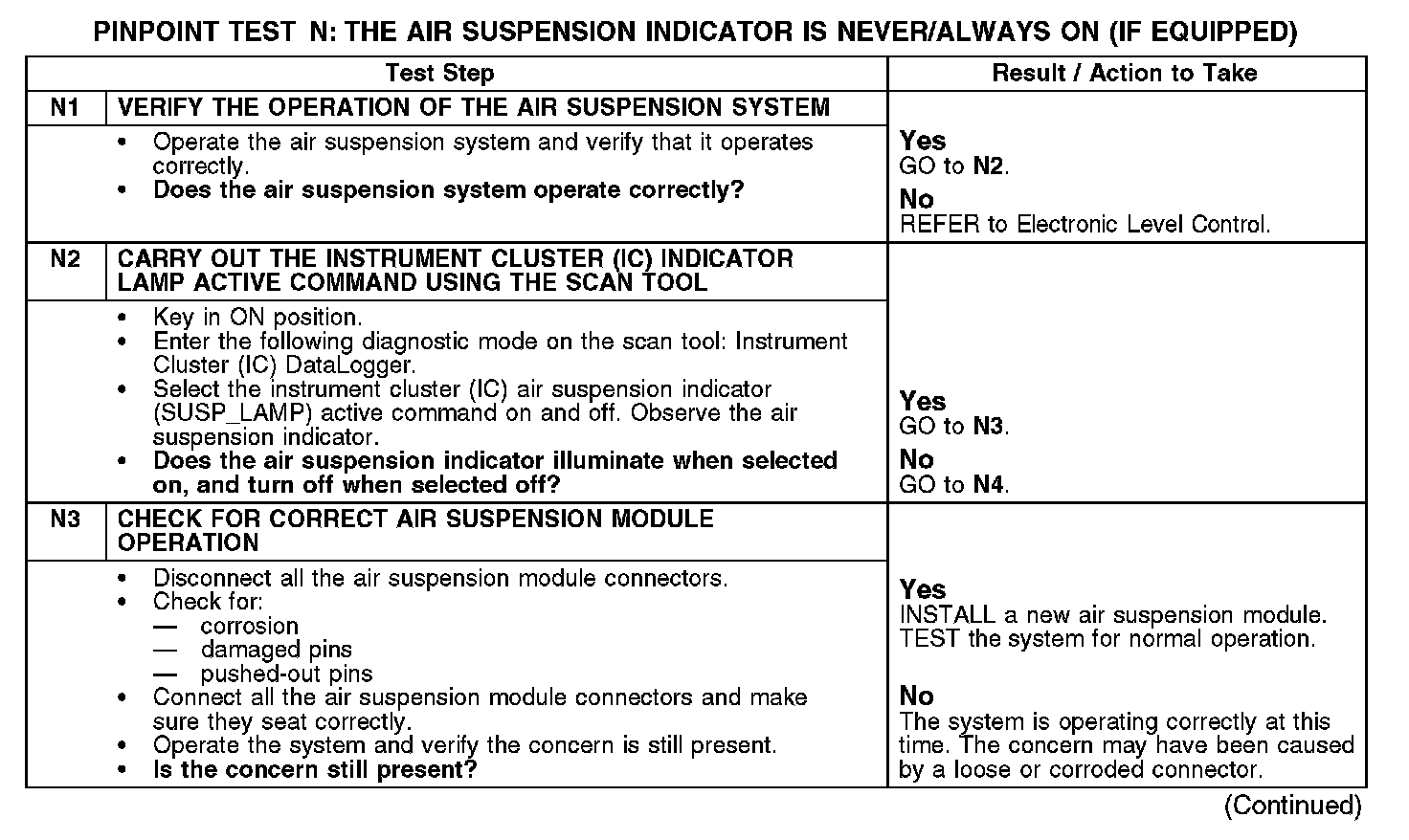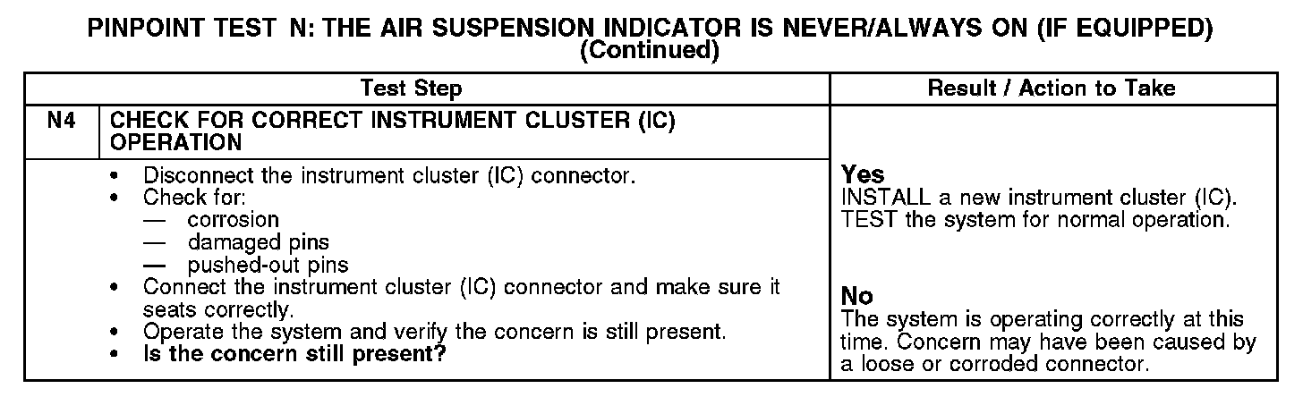 PINPOINT TEST N: THE AIR SUSPENSION INDICATOR IS NEVER/ALWAYS ON (IF EQUIPPED)Normal Operation