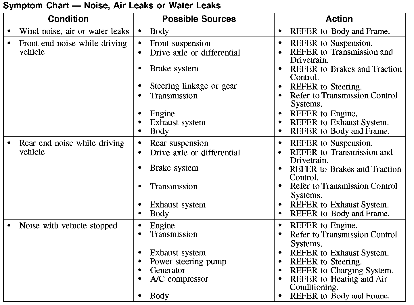 Symptom Chart - Noise, Air Leaks Or Water Leaks: