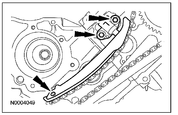 Position the LH timing chain tensioner arm on the dowel pin and install the LH timing chain tensioner.
