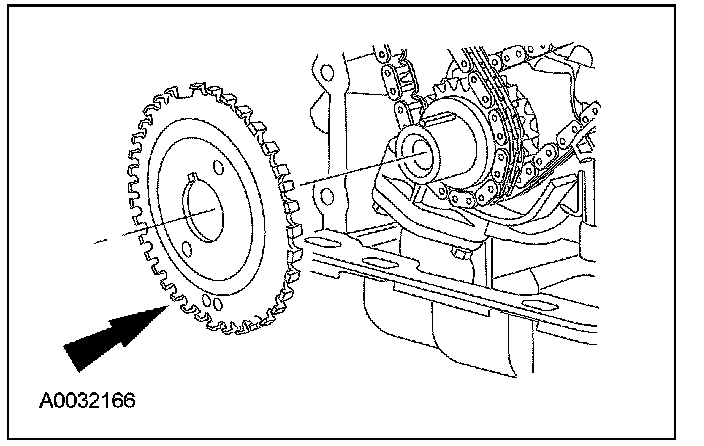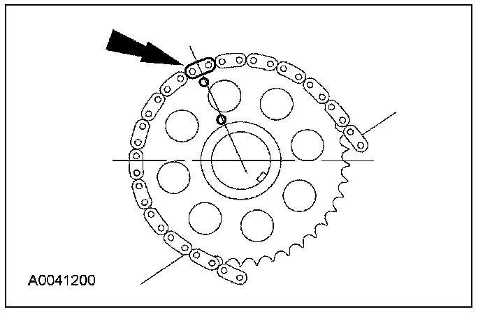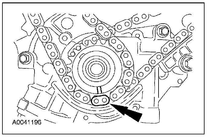 38. Position the RH (outer) timing chain on the crankshaft sprocket, aligning the copper (marked) link with the timing mark on the sprocket.