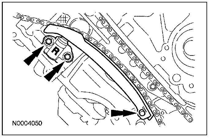 40. Position the RH timing chain tensioner arm on the dowel pin and install the RH timing chain tensioner.