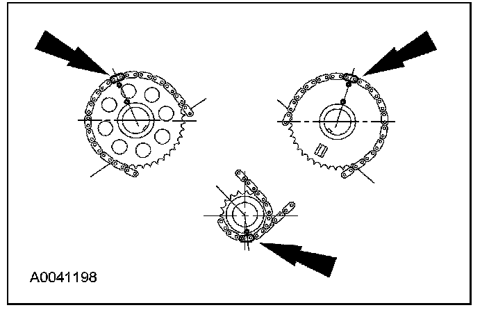 39. Install the RH timing chain on the camshaft sprocket, aligning the copper (marked) link with the timing marks on the sprocket.
