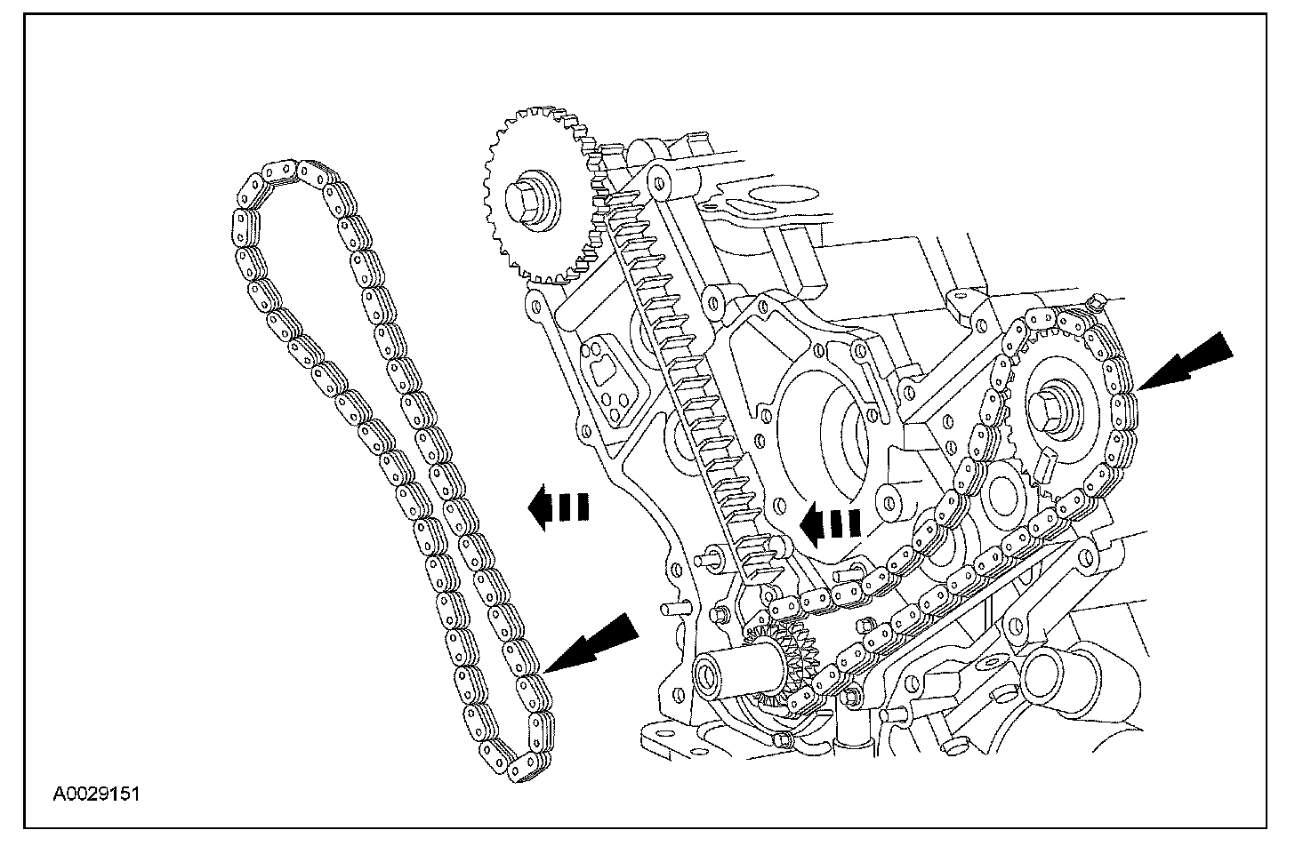 8. Position the LH (inner) timing chain on the crankshaft sprocket, aligning the copper (marked) link with the timing mark on the sprocket.