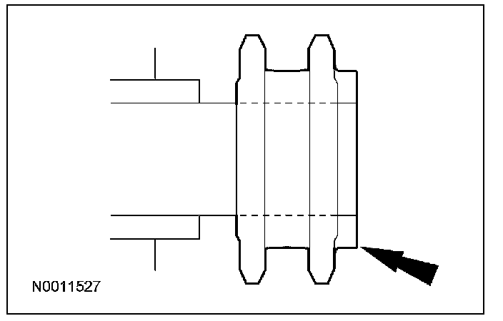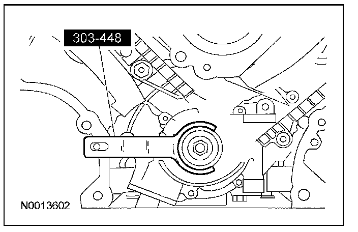 5. CAUTION: If one or both of the tensioner mounting bolts are loosened or removed, the tensioner-sealing bead must be inspected for seal integrity. If cracks, tears or separation from the tensioner body or permanent compression of the seal bead is observed, install a new tensioner. Failure to follow these instructions may result in engine damage.